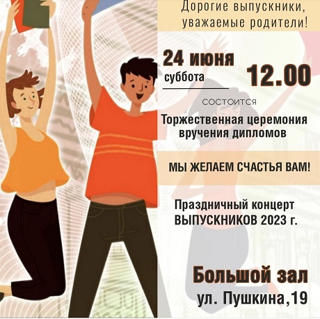 24 июня ( суббота) в 12.00 в Большом зале состоится торжественная церемония вручения дипломов и концерт выпускников 2023 г. " Мы желаем счастья вам!"