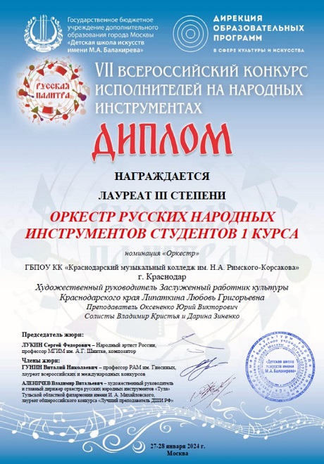 Высокое жюри по достоинству оценило представленную творческую работу студентов Краснодарского музыкального колледжа под руководством художественного руководителя и дирижера Любови Липаткиной, и творческой поддержке преподавателя Юрия Оксененко.