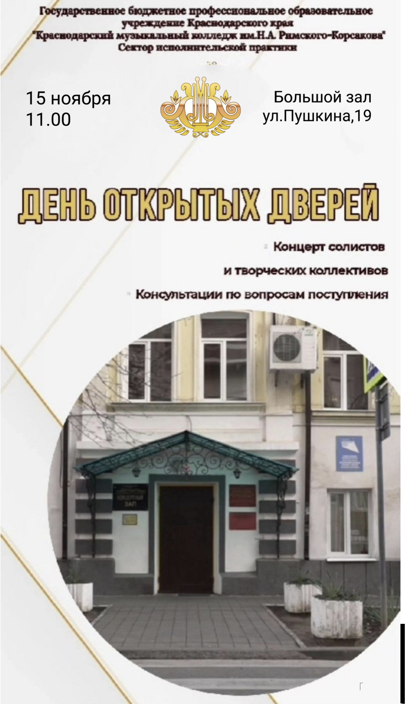 15 ноября в 11:00 приглашаем на День открытых дверей. В рамках мероприятия в Большом зале колледжа состоится концерт, в котором примут участие солисты и творческие коллективы всех специальностей учебного заведения. Вы сможете насладиться высококлассными выступлениями и увидеть разнообразие талантов наших студентов.