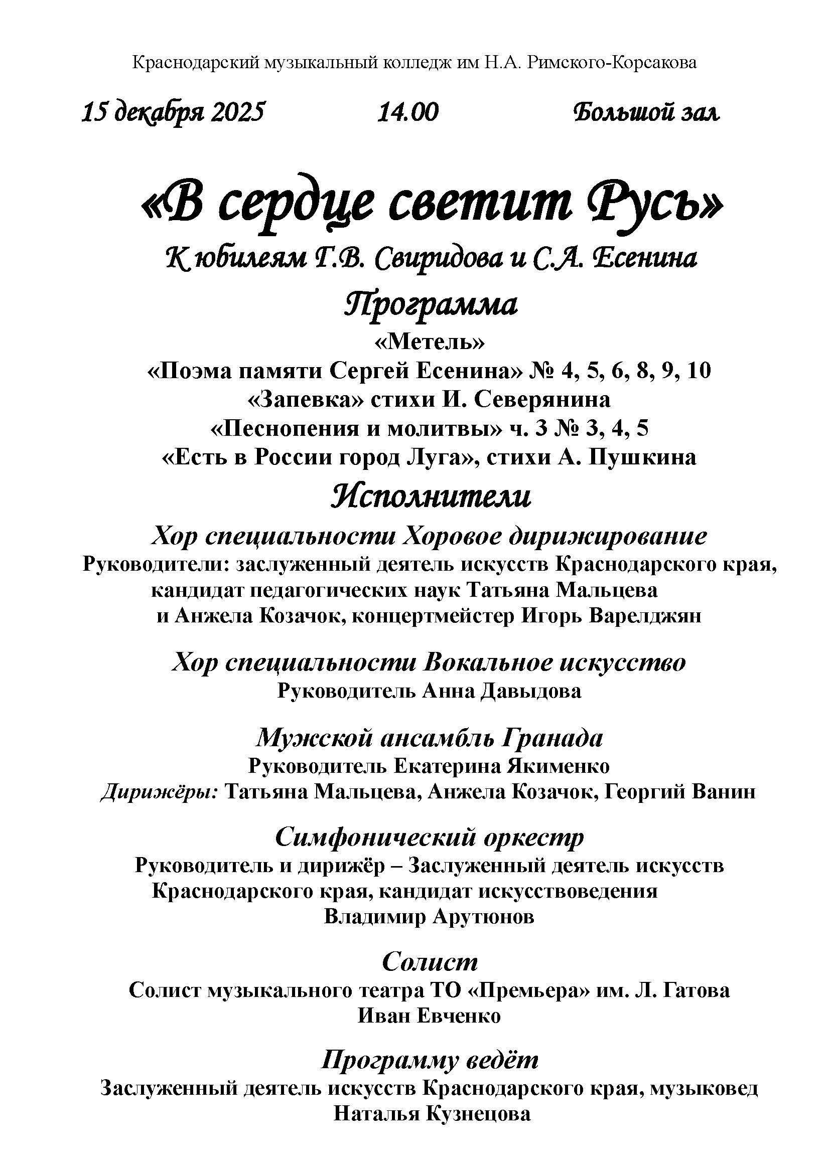 Концерт «В сердце светит Русь» К юбилеям Г.В. Свиридова и С.А. Есенина