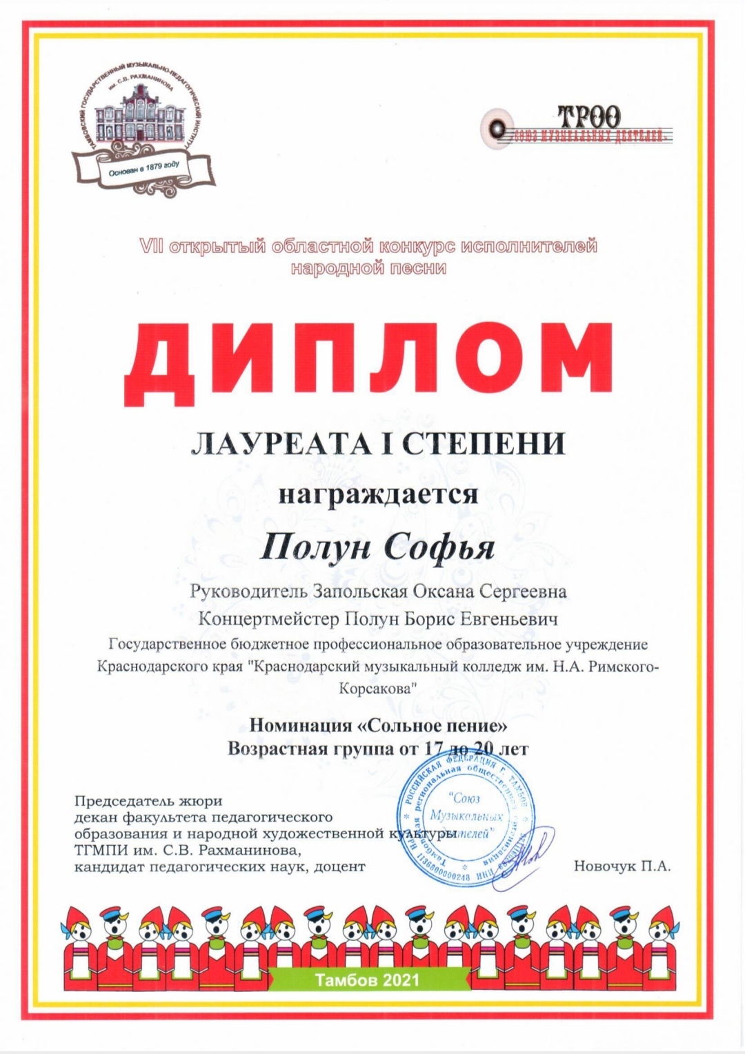 Поздравляем студентку 4 курса специальности «Сольное народное пение» Полун Софью, ставшую лауреатом I степени в номинации «Сольное пение» VII открытого областного конкурса исполнителей народной песни, который прошел на базе Тамбовского Государственного музыкально - педагогического института им. С.В. Рахманинова.