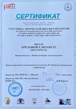Поздравляем Елизавету Орехову (класс преподавателя заслуженного артиста России Побигуцы Б.А.), ставшую лауреатом ll открытого республиканского музыкального конкурса-фестиваля инструментального исполнительства "Музыкальное созвездие Айвазовского"!